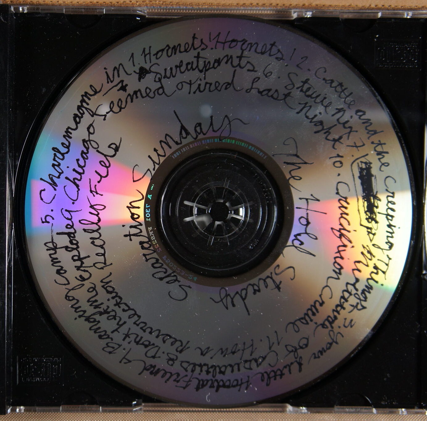 Teraz kilka słów jak oceniam stan zachowania płyt i ich okładek. Generalnie nie odsłuchuje CD w ogóle, jak lustro dysku jest czyste bez dużych rys to powinno grać bez jakichkolwiek ubytków. Jak na lustre widać dużo rysek, zadrapań etc to wtedy słucham takiej płyty czy nie ma zacięć i opisuję na stronie aukcji. Podobnie z poligrafią jest opisywana i fotografowana. Jak poligrafia dostaje ocene bardzo dobrą bez żadnych dotykowych uwag to znaczy że można znaleźć na niej ślady normalnego użytkowania, np odciśnięte plastikowe półokręgi, które ja trzymają by nie wypadła z pudełka. Samo plastikowe pudełko nie wchodzi w skład opisu stanu zachowania albumu.
