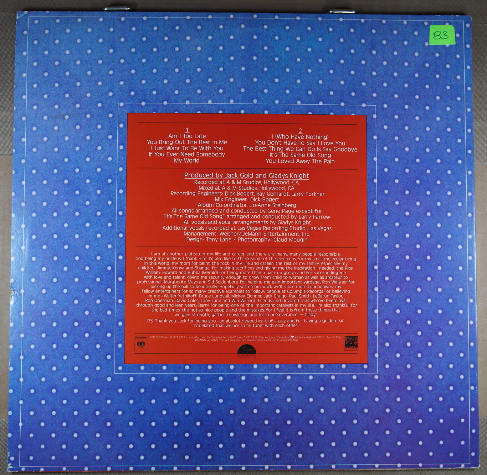 – płyta: była wielokrotnie odtwarzana, ale nie odznacza się słyszalnym spadkiem jakości dźwięku, pomimo śladów na powierzchni oraz nieznacznych zarysowań; które mogą być słyszalne drobne trzaski czy pyknięcia.