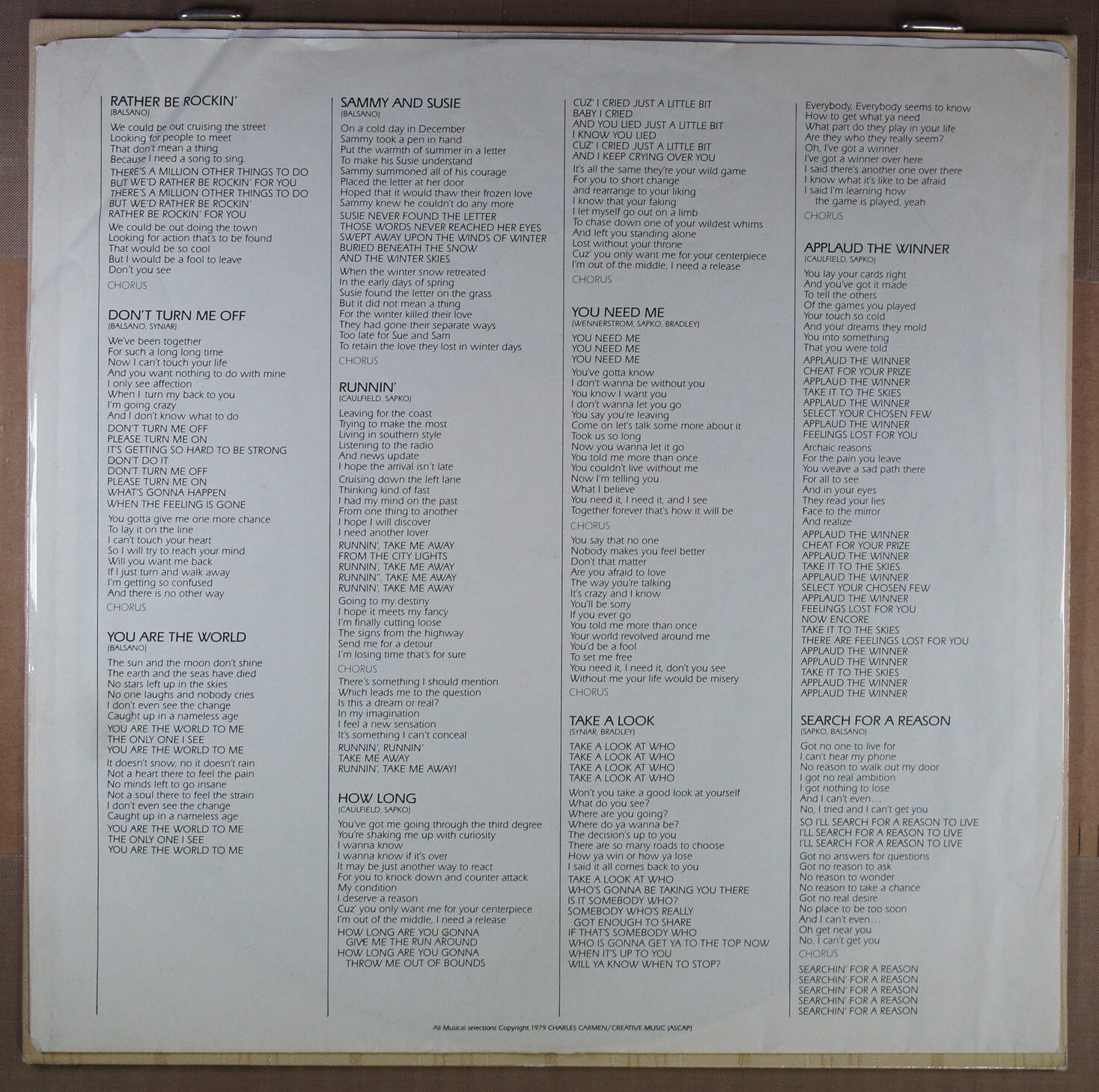 – płyta: była wielokrotnie odtwarzana, ale nie odznacza się słyszalnym spadkiem jakości dźwięku, pomimo śladów na powierzchni oraz nieznacznych zarysowań; które mogą być słyszalne drobne trzaski czy pyknięcia.